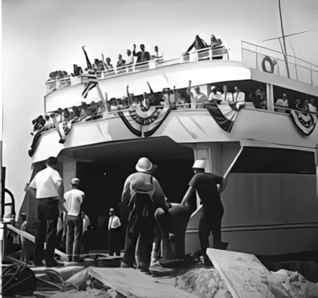 This picture shows the SS Cape May depart for Lewes on a trial run in June of 1964. On opening day, July 1, the same ship ran into a major issue when it tangled with an underwater cable, causing a major delay, and stranding DRBA officials and dignitaries on the other side.