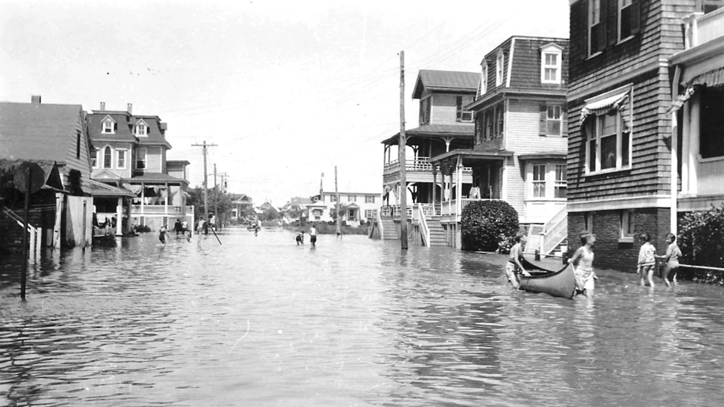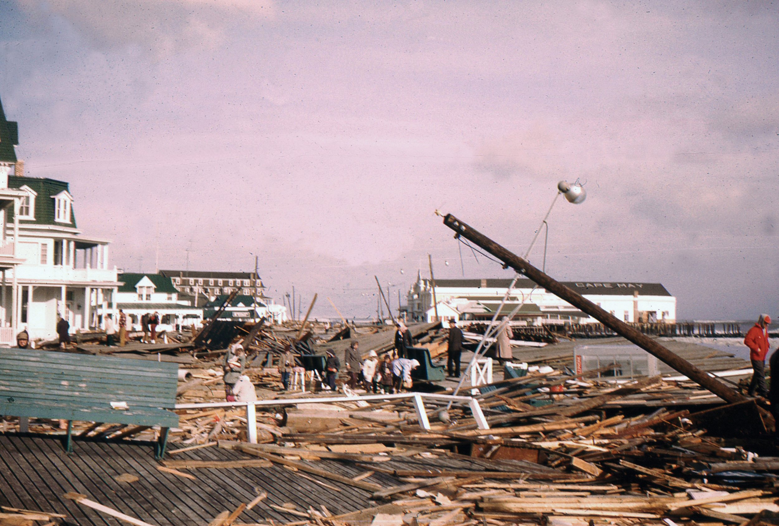 Consisting of two weather systems that joined forces, the monster pounded Cape May for three days with 63 mph winds and relentless 35-foot waves. As the nor’easter ended, the National Guard moved along Cape May’s Beach Avenue in rowboats, saving the stranded. More than 1,000 homes had been destroyed and the boardwalk was shredded. Convention Hall, an elaborate two-story structure overlooking the ocean, was ripped apart. Pieces of its balcony, meeting rooms, the ballroom where men in suits had once taken women in white gloves dancing, were scattered along the shore.
